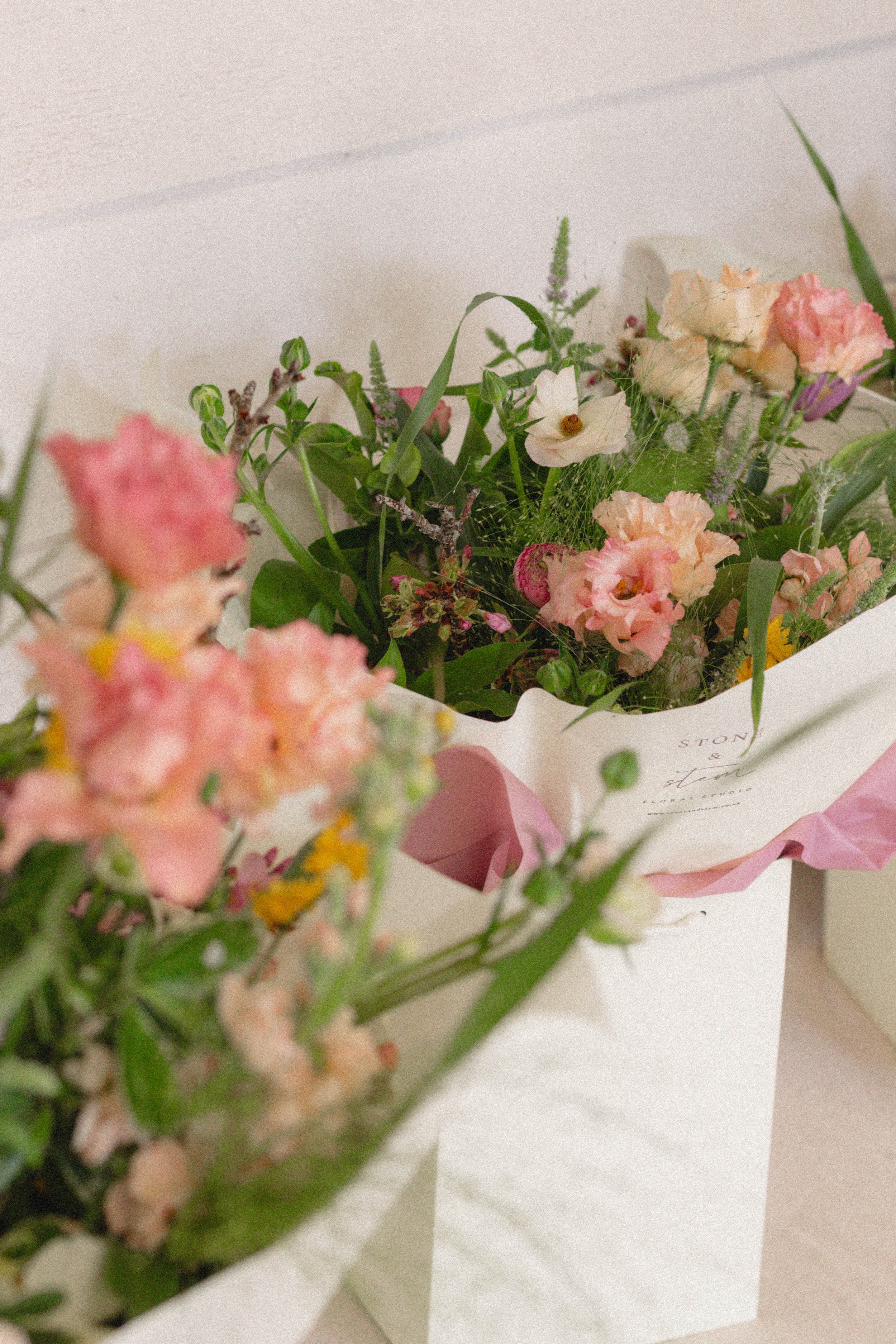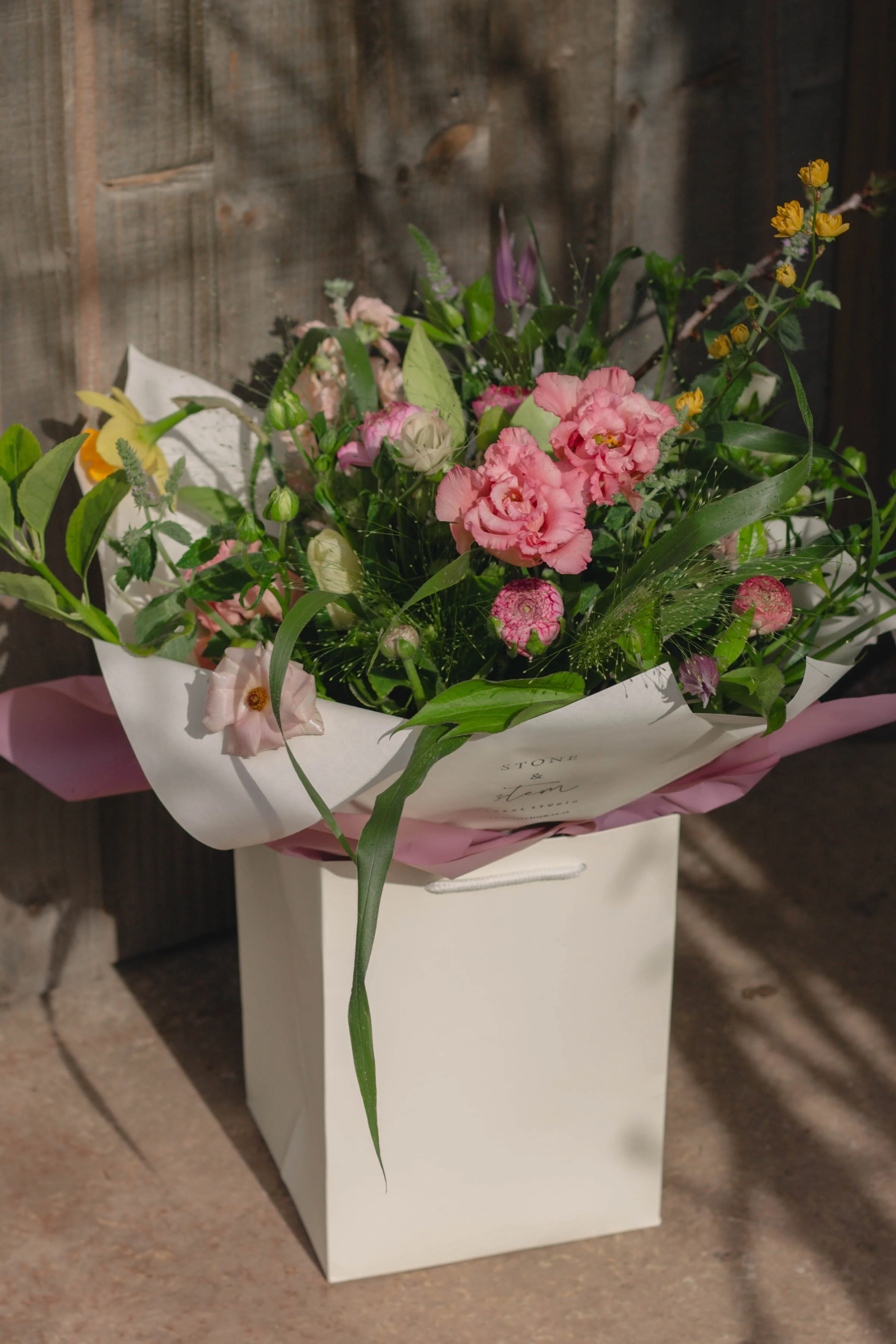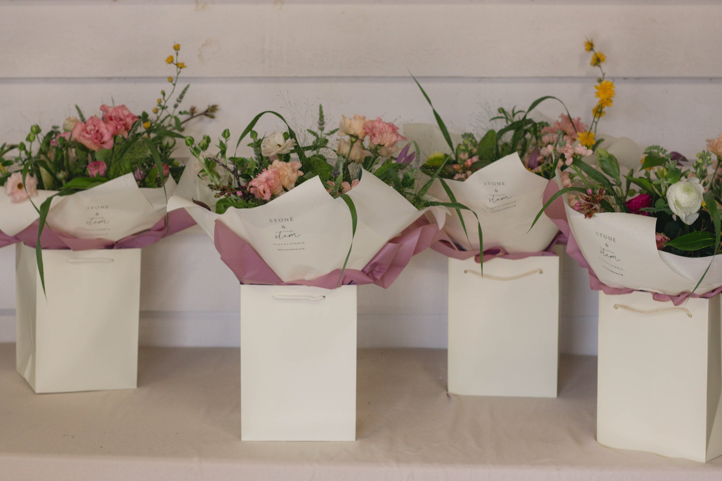 Each bouquet is created in a classic medium size, featuring pastel Spring inspired colours, with stunning seasonal flowers alongside textural foliage. Each bouquet is beautifully wrapped with a water source within a luxury gift bag, perfectly finishing the bouquet.
